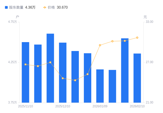 近一年(2025年2月10日至2026年2月10日),彩讯股份A股股东户数从6.08万户,减低至4.36万户,降幅28.30%,区间股价上涨5.61%。