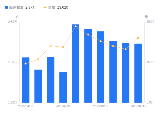 近一年(2025年2月28日至2026年1月30日),扬帆新材A股股东户数从2.11万户,增加至2.37万户,增幅12.63%,区间股价上涨28.15%。