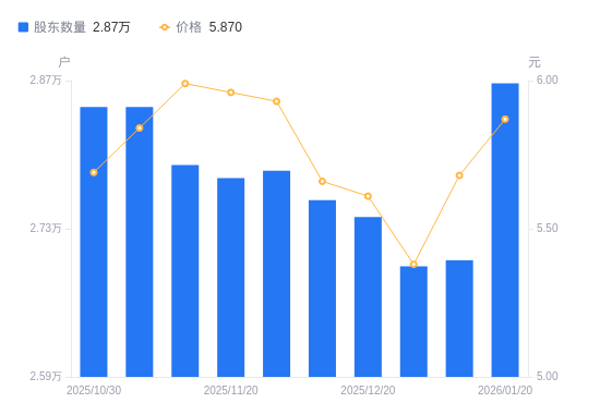 1月30日消息,数据显示,截至2026年1月20日,凯普生物A股股东总户数为2.87万户,较上期(2026年1月9日)增加1672户,增幅6.19%。公司最新A股总股本为6.47亿股,其中流通A股6.35亿股,户均持有流通A股数量为2.22万股,较上期减少1371.73股,降幅5.83%;户均持流通A股市值13万元,较上期减少3582.56元,降幅2.68%。