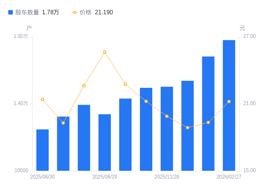 近一年(2025年2月28日至2026年2月27日),万通智控A股股东户数从1.69万户,增加至1.78万户,增幅5.31%,区间股价上涨60.88%。