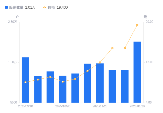 近一年(2025年1月20日至2026年1月20日),延江股份A股股东户数从1.3万户,增加至2.01万户,增幅55.04%,区间股价上涨278.83%。