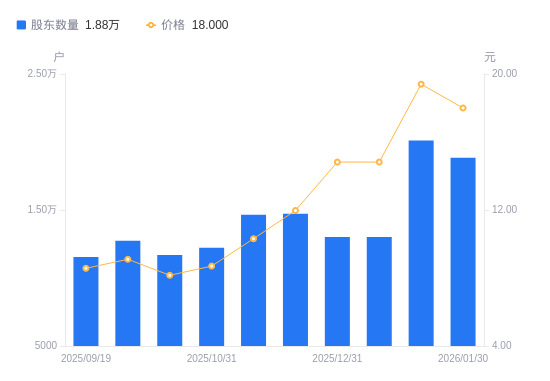 近一年(2025年2月28日至2026年1月30日),延江股份A股股东户数从1.21万户,增加至1.88万户,增幅55.31%,区间股价上涨217.97%。