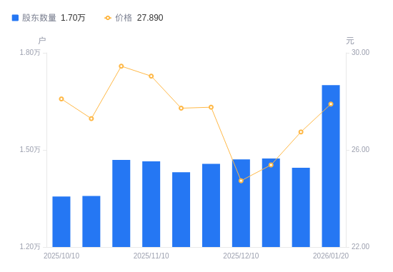 1月28日消息,数据显示,截至2026年1月20日,科锐国际A股股东总户数为1.7万户,较上期(2026年1月9日)增加2551户,增幅17.66%。公司最新A股总股本为1.97亿股,其中流通A股1.96亿股,户均持有流通A股数量为1.15万股,较上期减少2038.49股,降幅15.01%;户均持流通A股市值32.2万元,较上期减少4.12万元,降幅11.35%。