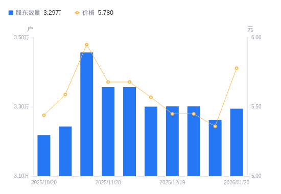 近一年(2025年1月20日至2026年1月20日),鹏鹞环保A股股东户数从3.76万户,减低至3.29万户,降幅12.28%,区间股价上涨14.82%。