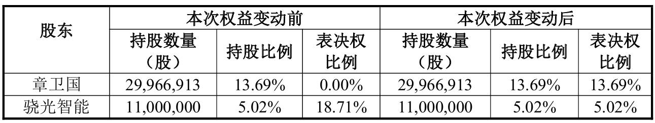 2026年2月11日,章卫国及上海骁光智能技术有限公司一致同意终止表决权委托协议,公司的控股股东和实际控制人恢复为章卫国。终止协议签订后,股东章卫国和骁光智能所持股份拥有的权益变动情况如下: