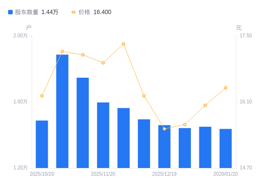 近一年(2025年1月20日至2026年1月20日),建科院A股股东户数从1.7万户,减低至1.44万户,降幅15.45%,区间股价上涨14.61%。