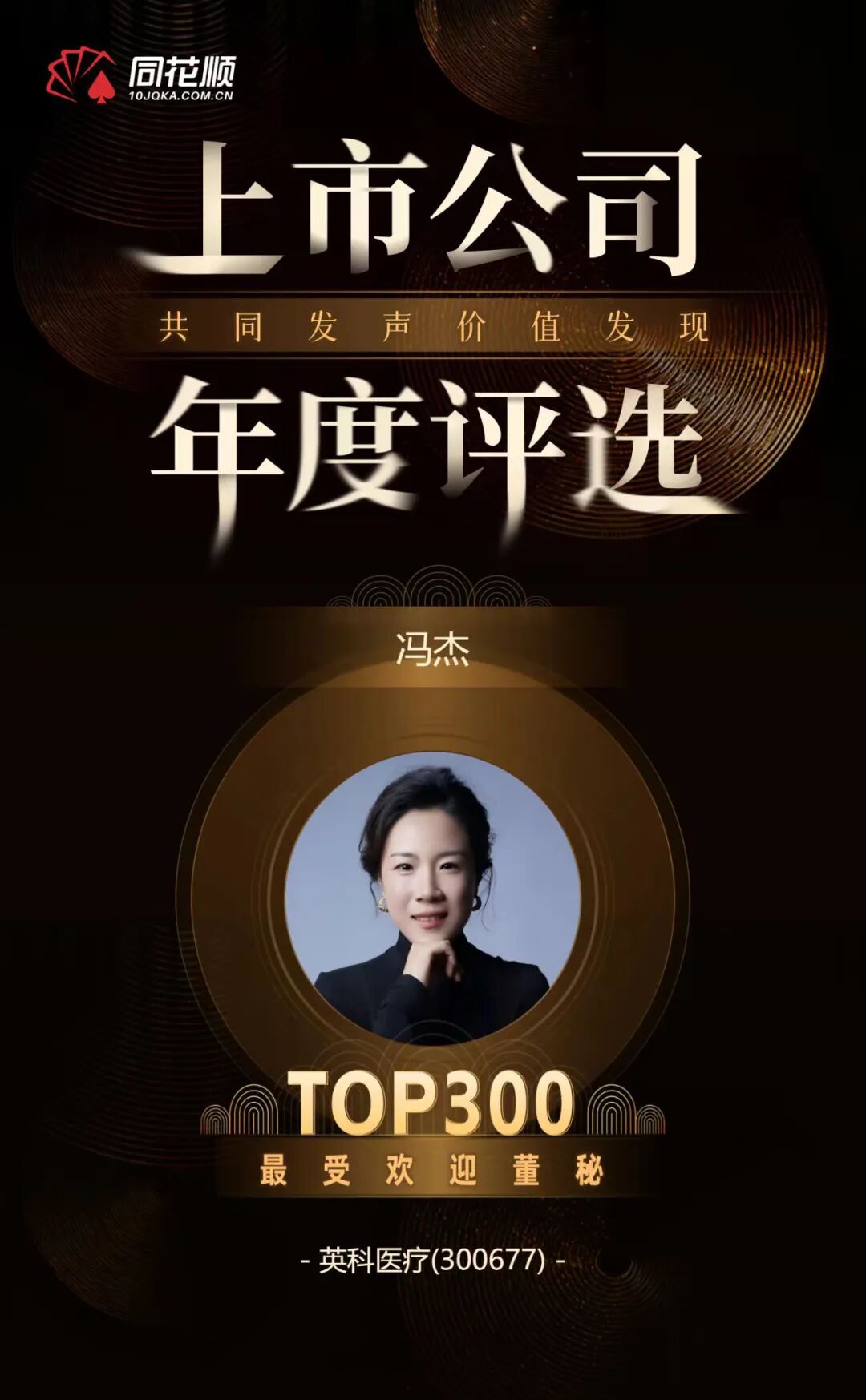 近日,在同花顺(300033)财经发起的上市公司年度评选中,英科医疗(300677)董事会秘书冯杰女士,凭借在信息披露、投资者关系管理等方面的卓越表现,成功上榜“最受欢迎董秘TOP300”,充分体现了资本市场对其专业能力与履职成效的高度认可。