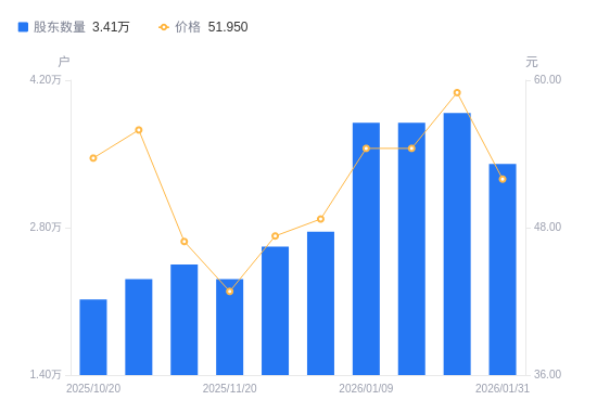 近一年(2025年1月20日至2026年1月10日),隆盛科技A股股东户数从1.93万户,增加至3.8万户,增幅96.66%,区间股价上涨130.49%。