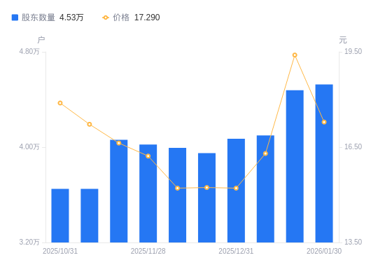 2月2日消息,数据显示,截至2026年1月20日,朗新科技A股股东总户数为4.48万户,较上期(2026年1月9日)增加3790户,增幅9.25%。公司最新A股总股本为10.78亿股,其中流通A股10.32亿股,户均持有流通A股数量为2.3万股,较上期减少2130.79股,降幅8.46%;户均持流通A股市值44.71万元,较上期增加3.67万元,增幅8.95%。