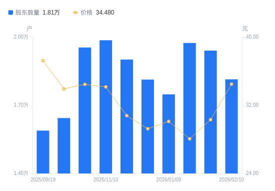近一年(2025年2月10日至2026年2月10日),海特生物A股股东户数从1.07万户,增加至1.81万户,增幅70.01%,区间股价上涨46.41%。