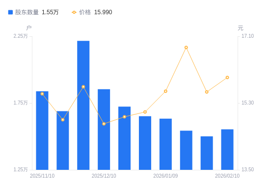 近一年(2025年2月10日至2026年2月10日),智动力A股股东户数从2.04万户,减低至1.55万户,降幅23.97%,区间股价上涨73.99%。