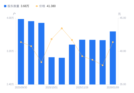 1月22日消息,数据显示,截至2026年1月9日,盛弘股份A股股东总户数为3.68万户,较上期(2025年12月19日)增加2103户,增幅6.06%。公司最新A股总股本为3.13亿股,其中流通A股2.69亿股,户均持有流通A股数量为7309.36股,较上期减少443.25股,降幅5.72%;户均持流通A股市值30.25万元,较上期增加8714.8元,增幅2.97%。