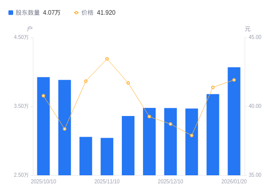 近一年(2025年1月27日至2026年1月20日),盛弘股份A股股东户数从3.28万户,增加至4.07万户,增幅23.83%,区间股价上涨36.54%。