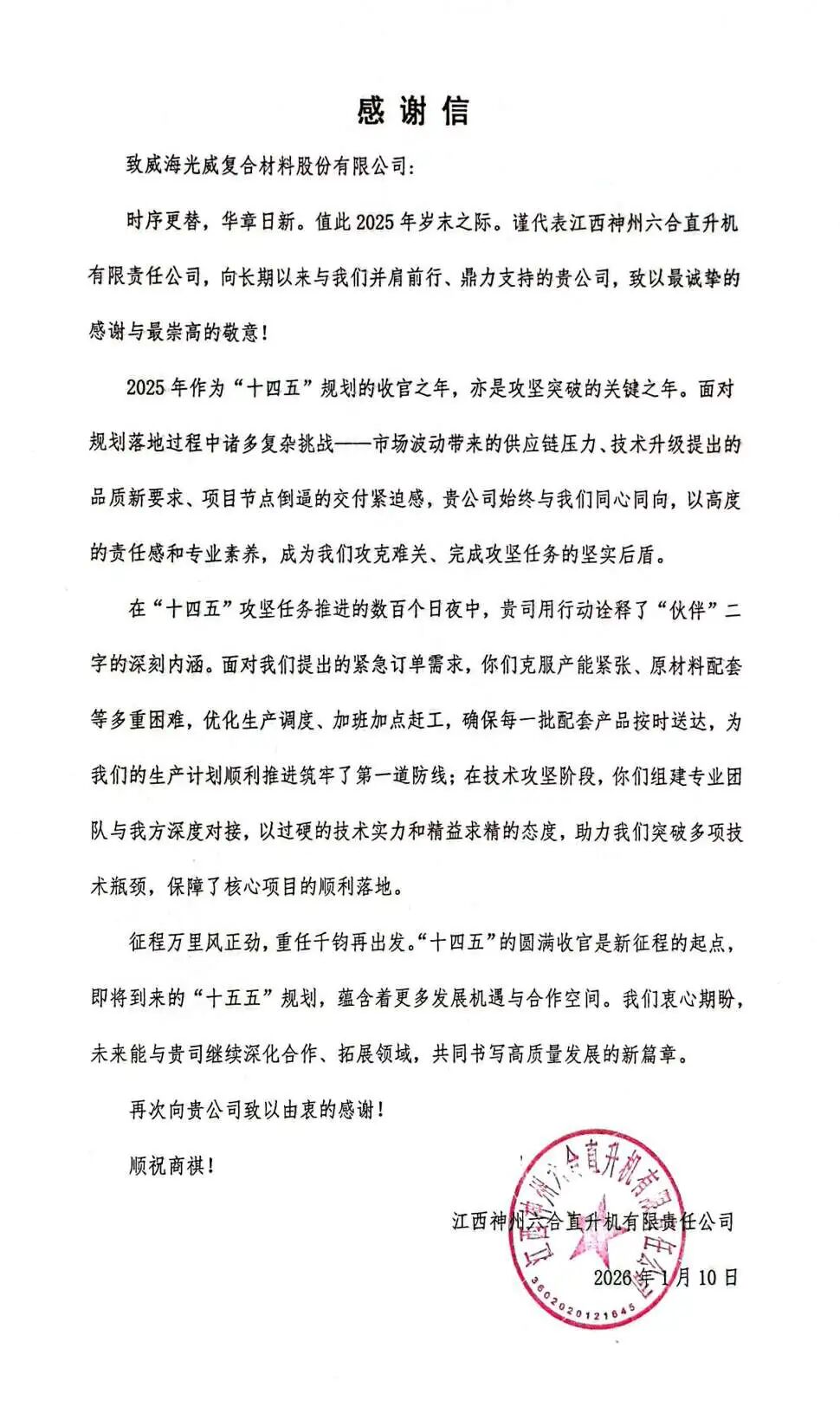 年关将至,暖意绵长。2月10日,光威复材(300699)收到客户发来的感谢信,字里行间的认可与肯定,是岁末最珍贵的馈赠。未来,光威复材将以此为激励,依托全产业链布局优势,持续做好各型号碳纤维及复合材料的交付管理与质量管控,精益求精打磨产品性能,助力双方高质量发展。