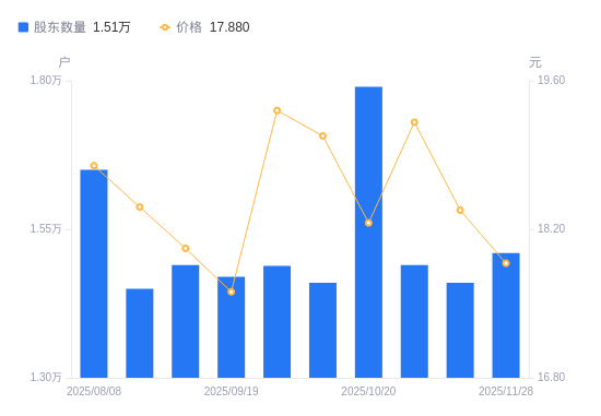 近一年(2024年11月29日至2025年11月28日),英可瑞A股股东户数从1.87万户,减低至1.51万户,降幅19.36%,区间股价上涨3.35%。