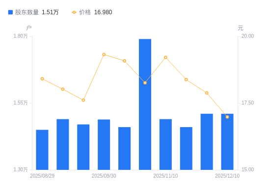 近一年(2024年12月10日至2025年12月10日),英可瑞A股股东户数从1.86万户,减低至1.51万户,降幅18.77%,区间股价下跌3.90%。