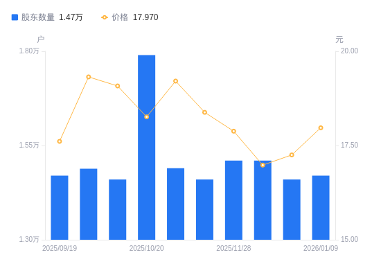 近一年(2025年1月10日至2026年1月9日),英可瑞A股股东户数从1.73万户,减低至1.47万户,降幅14.93%,区间股价上涨17.22%。