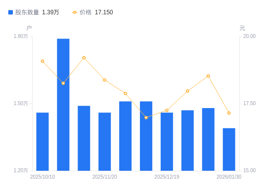 近一年(2025年2月10日至2026年1月30日),英可瑞A股股东户数从1.67万户,减低至1.39万户,降幅16.87%,区间股价上涨10.57%。