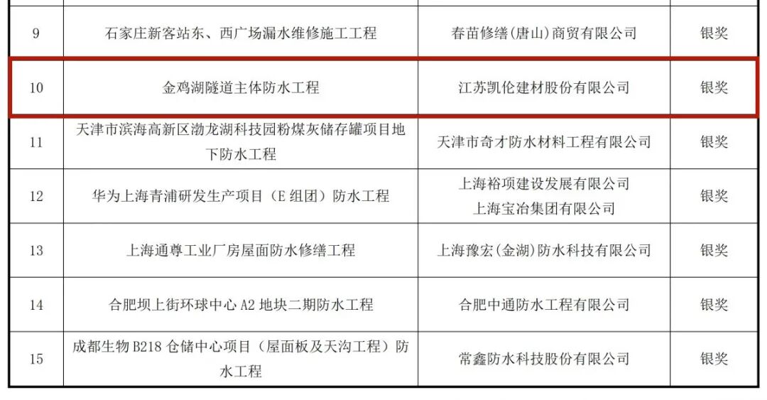 其中,凯伦股份(300715)凭借“金鸡湖隧道主体防水工程”案例斩获工程技术奖银奖一枚,再次有力彰显融合防水系统的卓越品质。
