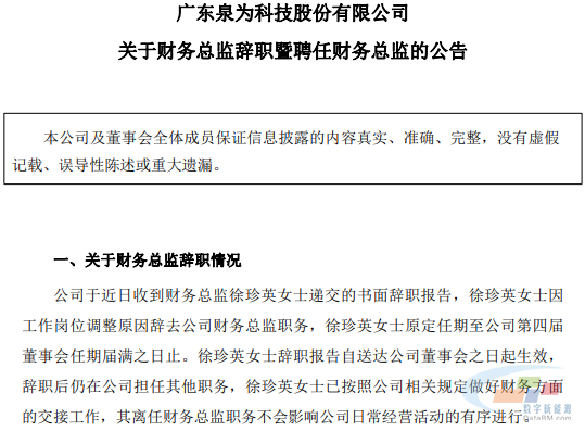 1月22日晚间,ST泉为发布公告称,公司于近日收到财务总监徐珍英递交的书面辞职报告,徐珍英因工作岗位调整原因辞去公司财务总监职务。徐珍英的辞职报告自送达公司董事会之日起生效,辞职后其仍在公司担任其他职务。