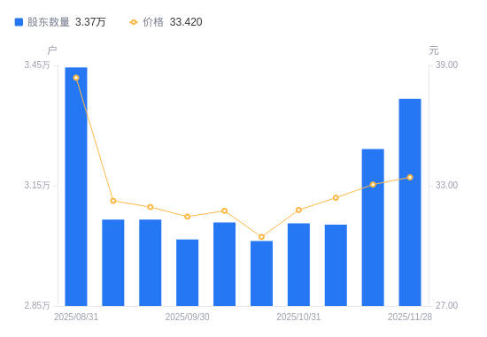 12月1日消息,数据显示,截至2025年11月28日,新余国科A股股东总户数为3.37万户,较上期(2025年11月20日)增加1247户,增幅3.85%。公司最新A股总股本为2.77亿股,其中流通A股2.77亿股,户均持有流通A股数量为8220.9股,较上期减少316.23股,降幅3.70%;户均持流通A股市值27.47万元,较上期减少7494.95元,降幅2.66%。