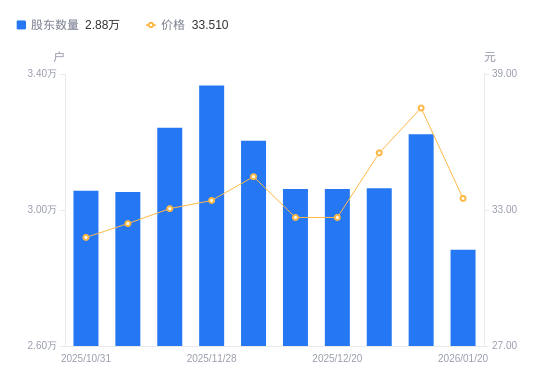 近一年(2025年1月20日至2026年1月20日),新余国科A股股东户数从2.44万户,增加至2.88万户,增幅18.23%,区间股价上涨30.49%。