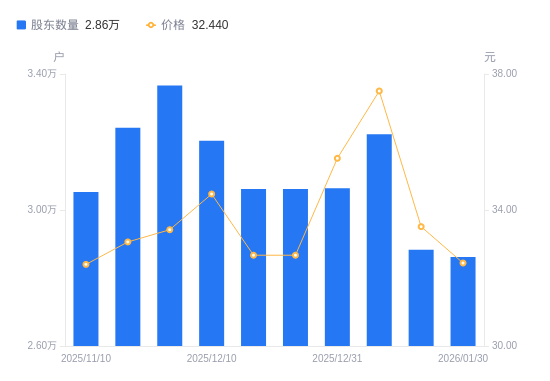 2月3日消息,数据显示,截至2026年1月30日,新余国科A股股东总户数为2.86万户,较上期(2026年1月20日)减少216户,降幅0.75%。公司最新A股总股本为2.77亿股,其中流通A股2.77亿股,户均持有流通A股数量为9671.73股,较上期增加72.46股,增幅0.75%;户均持流通A股市值31.38万元,较上期减少7920.62元,降幅2.46%。