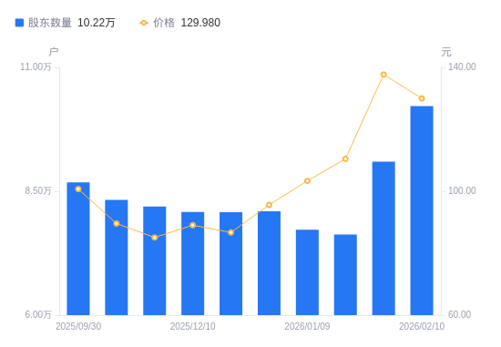 近一年(2025年2月28日至2026年2月10日),捷佳伟创A股股东户数从6.37万户,增加至10.22万户,增幅60.37%,区间股价上涨100.42%。