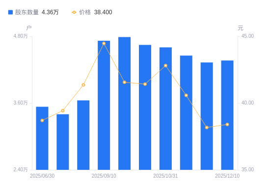 12月18日消息,数据显示,截至2025年12月10日,药石科技A股股东总户数为4.36万户,较上期(2025年11月28日)增加351户,增幅0.81%。公司最新A股总股本为2.34亿股,其中流通A股2.03亿股,户均持有流通A股数量为4644.29股,较上期减少37.65股,降幅0.80%;户均持流通A股市值17.83万元,较上期减少368.93元,降幅0.21%。