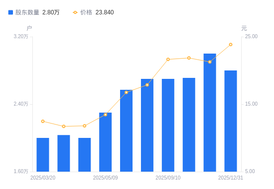 1月5日消息,数据显示,截至2025年12月31日,水羊股份A股股东总户数为2.8万户,较上期(2025年11月10日)减少2000户,降幅6.67%。公司最新A股总股本为3.9亿股,其中流通A股3.59亿股,户均持有流通A股数量为1.28万股,较上期增加854.78股,增幅7.14%;户均持流通A股市值30.56万元,较上期增加5.13万元,增幅20.15%。