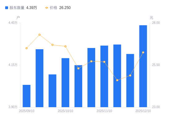 12月11日消息,数据显示,截至2025年12月10日,锐科激光A股股东总户数为4.39万户,较上期(2025年11月28日)增加1703户,增幅4.04%。公司最新A股总股本为5.65亿股,其中流通A股5.22亿股,户均持有流通A股数量为1.19万股,较上期减少480.72股,降幅3.88%;户均持流通A股市值31.24万元,较上期增加4343.43元,增幅1.41%。