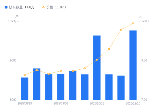 近一年(2024年12月31日至2025年12月10日),顶固集创A股股东户数从9937户,增加至1.08万户,增幅8.99%,区间股价上涨87.52%。