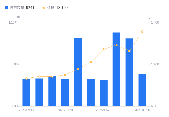 近一年(2025年2月10日至2026年1月30日),顶固集创A股股东户数从9042户,减低至8530户,降幅5.66%,区间股价上涨150.97%。