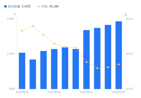 近一年(2024年12月10日至2025年12月10日),新诺威A股股东户数从1.53万户,增加至2.43万户,增幅58.95%,区间股价上涨13.86%。