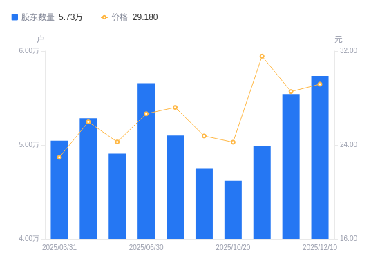 12月11日消息,数据显示,截至2025年12月10日,三角防务A股股东总户数为5.73万户,较上期(2025年11月30日)增加1927户,增幅3.48%。公司最新A股总股本为5.48亿股,其中流通A股5.32亿股,户均持有流通A股数量为9269.4股,较上期减少322.3股,降幅3.36%;户均持流通A股市值27.05万元,较上期减少3361.92元,降幅1.23%。