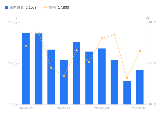 近一年(2024年11月29日至2025年11月28日),德恩精工A股股东户数从2.25万户,减低至2.15万户,降幅4.22%,区间股价下跌1.22%。