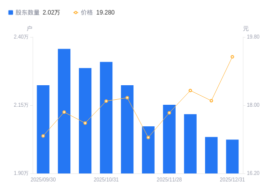1月22日消息,数据显示,截至2026年1月20日,德恩精工A股股东总户数为2.34万户,较上期(2025年12月31日)增加3178户,增幅15.70%。公司最新A股总股本为1.47亿股,其中流通A股1.08亿股,户均持有流通A股数量为4591.98股,较上期减少721.01股,降幅13.57%;户均持流通A股市值11.23万元,较上期增加9839.4元,增幅9.61%。