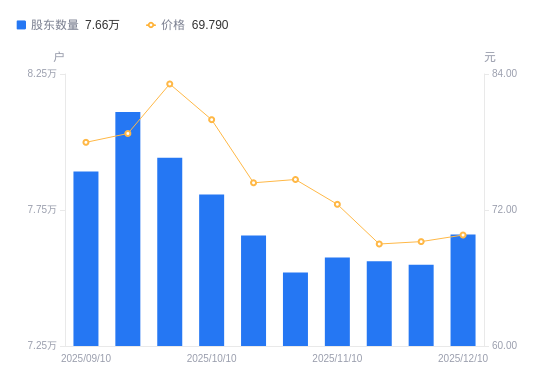12月12日消息,数据显示,截至2025年12月10日,卓胜微A股股东总户数为7.66万户,较上期(2025年11月28日)增加1109户,增幅1.47%。公司最新A股总股本为5.35亿股,其中流通A股4.48亿股,户均持有流通A股数量为5852.18股,较上期减少85.98股,降幅1.45%;户均持流通A股市值40.84万元,较上期减少2556.21元,降幅0.62%。