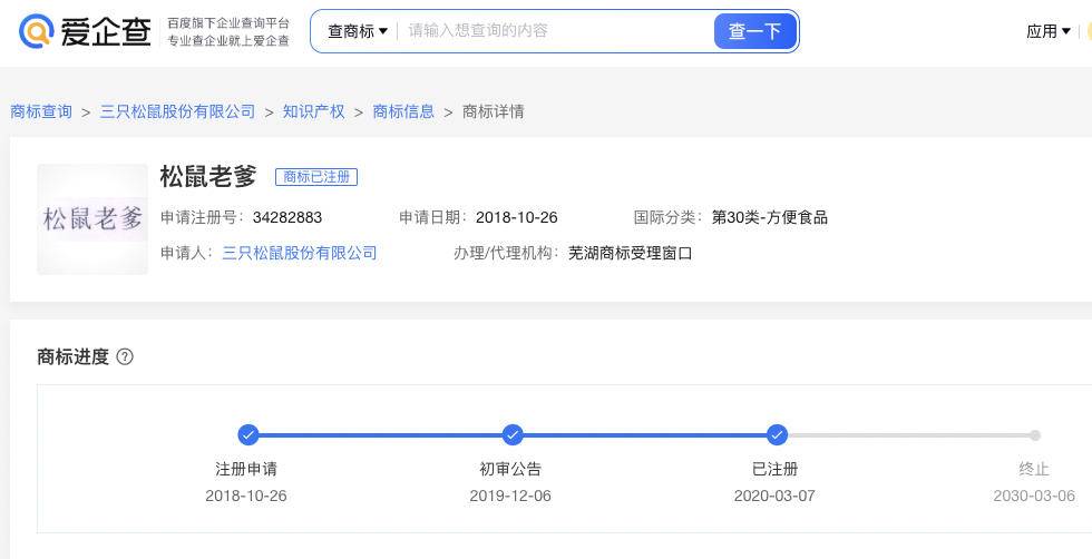 知识产权信息显示,该公司已成功注册多枚“松鼠老爹”商标,国际分类涉及方便食品、日化用品、珠宝钟表等。