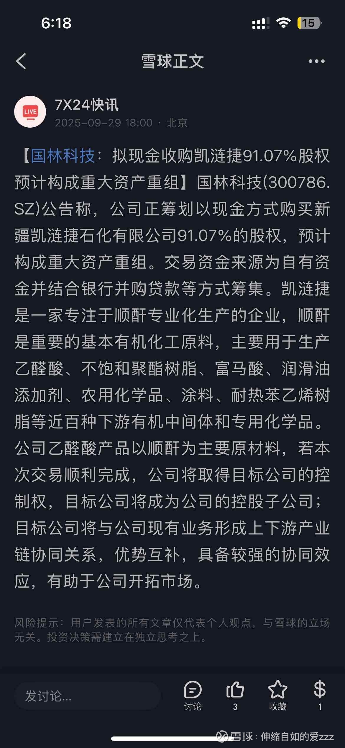 【国林科技:拟现金收购凯涟捷91.07%股权 预计构成重大资产重组】国林科技(300786.SZ)公告称,公司正筹划以现金方式购买新疆凯涟捷石化有限公司91.07%的股权,预计构成重大资产重组。交易资金来源为自有资金并结合银行并购贷款等方式筹集。凯涟捷是一家专注于顺酐专业化生产的企业,顺酐是重要的基...