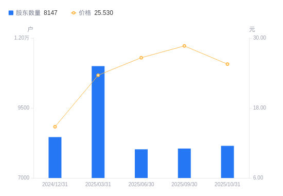 近一年(2024年12月31日至2025年10月31日),唐源电气A股股东户数从8463户,减低至8147户,降幅3.73%,区间股价上涨68.20%。