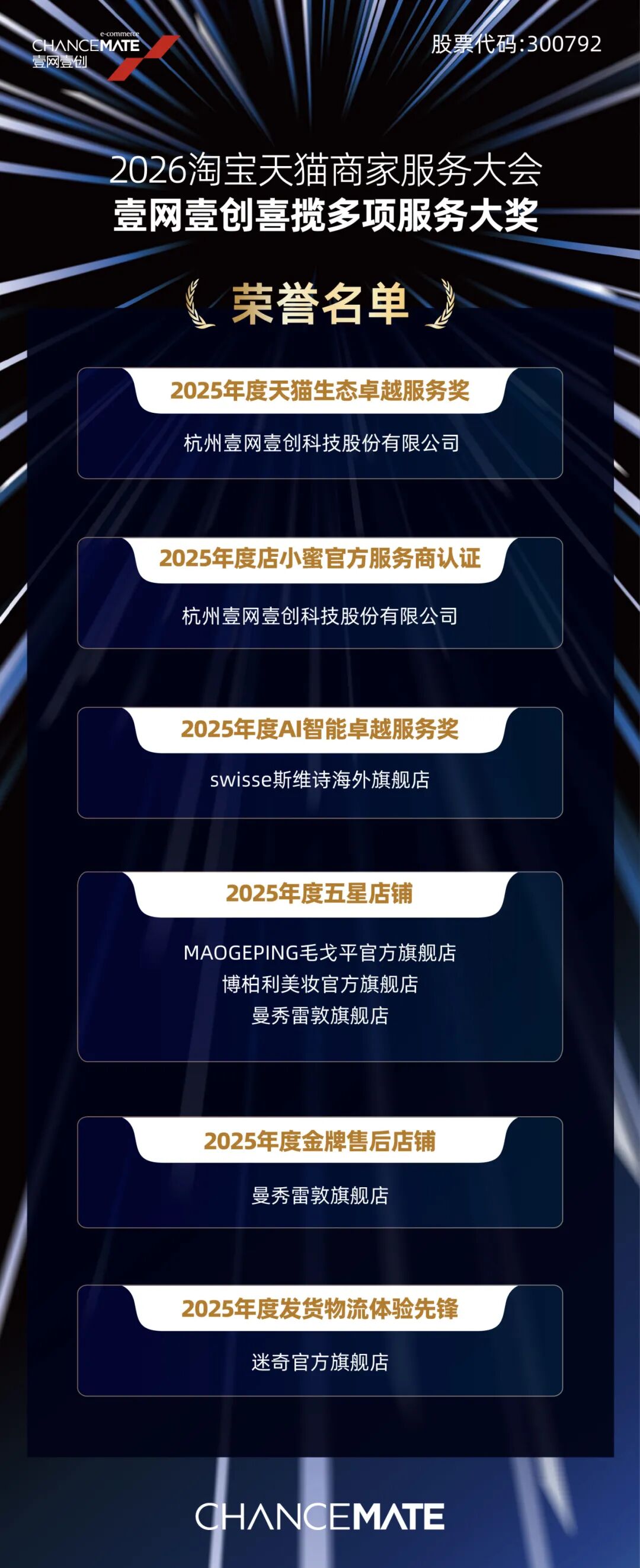 在近日以“好服务 构筑韧性增长”为主题的2026淘天集团商家服务大会上,壹网壹创(300792)凭借在电商服务领域的突出表现,特别是在AI智能客服应用方面的深入实践,荣获淘天集团颁发的“2025年度天猫生态卓越服务奖”与“2025年度店小蜜官方服务商认证”。
