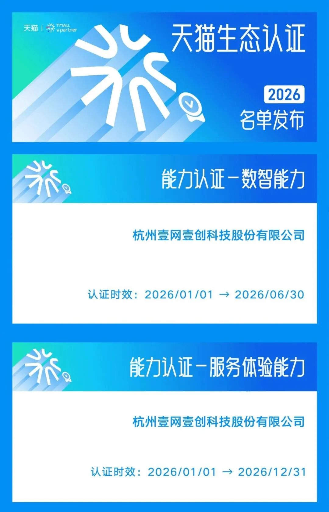 近日,天猫接连公布2026年度生态认证名单。壹网壹创(300792)凭借领先的AI数智化应用能力与卓越的客户服务运营体系,成功通过“数智能力认证”与“服务体验能力认证”,成为在数据策略与服务体验两大关键维度均获平台官方认可的服务商。