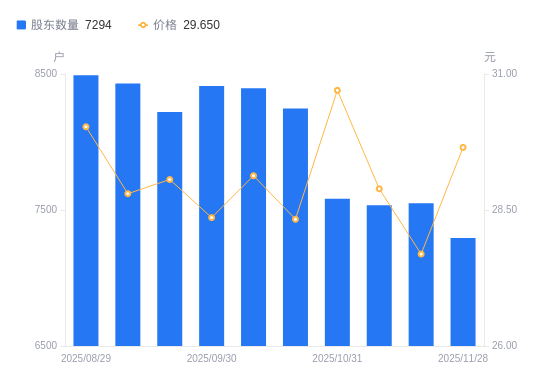 12月2日消息,数据显示,截至2025年11月28日,久量股份A股股东总户数为7294户,较上期(2025年11月20日)减少256户,降幅3.39%。公司最新A股总股本为1.6亿股,其中流通A股1.19亿股,户均持有流通A股数量为1.63万股,较上期增加552.72股,增幅3.51%;户均持流通A股市值48.33万元,较上期增加4.73万元,增幅10.84%。