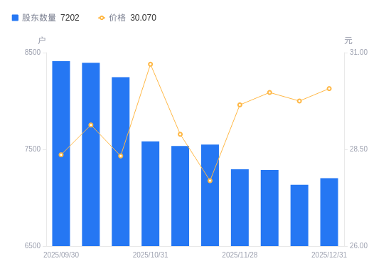 近一年(2024年12月31日至2025年12月31日),久量股份A股股东户数从7474户,减低至7202户,降幅3.64%,区间股价上涨30.06%。