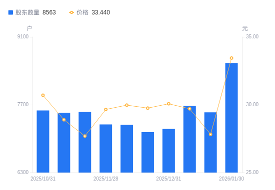 近一年(2025年2月10日至2026年1月30日),久量股份A股股东户数从6941户,增加至8563户,增幅23.37%,区间股价上涨24.36%。