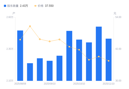 11月12日消息,数据显示,截至2025年11月10日,华辰装备A股股东总户数为2.43万户,较上期(2025年10月31日)减少943户,降幅3.73%。公司最新A股总股本为2.54亿股,其中流通A股1.51亿股,户均持有流通A股数量为6191.18股,较上期增加231.1股,增幅3.88%;户均持流通A股市值23.25万元,较上期减少977.52元,降幅0.42%。