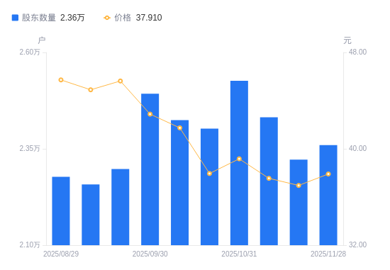 近一年(2024年11月29日至2025年11月28日),华辰装备A股股东户数从2.03万户,增加至2.36万户,增幅16.41%,区间股价上涨46.37%。