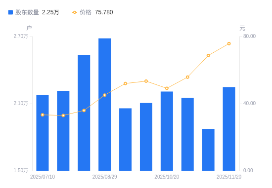 近一年(2024年11月29日至2025年11月20日),中富电路A股股东户数从1.78万户,增加至2.25万户,增幅26.52%,区间股价上涨153.61%。