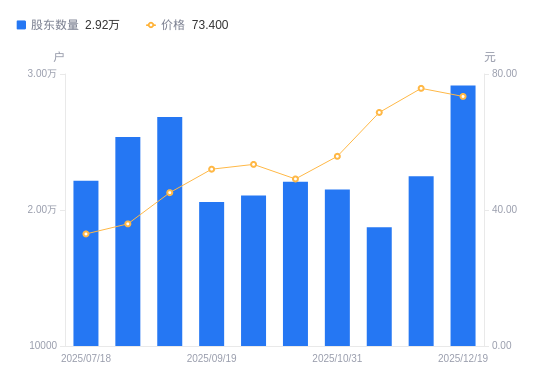 近一年(2024年12月20日至2025年12月19日),中富电路A股股东户数从2.06万户,增加至2.92万户,增幅41.75%,区间股价上涨107.05%。